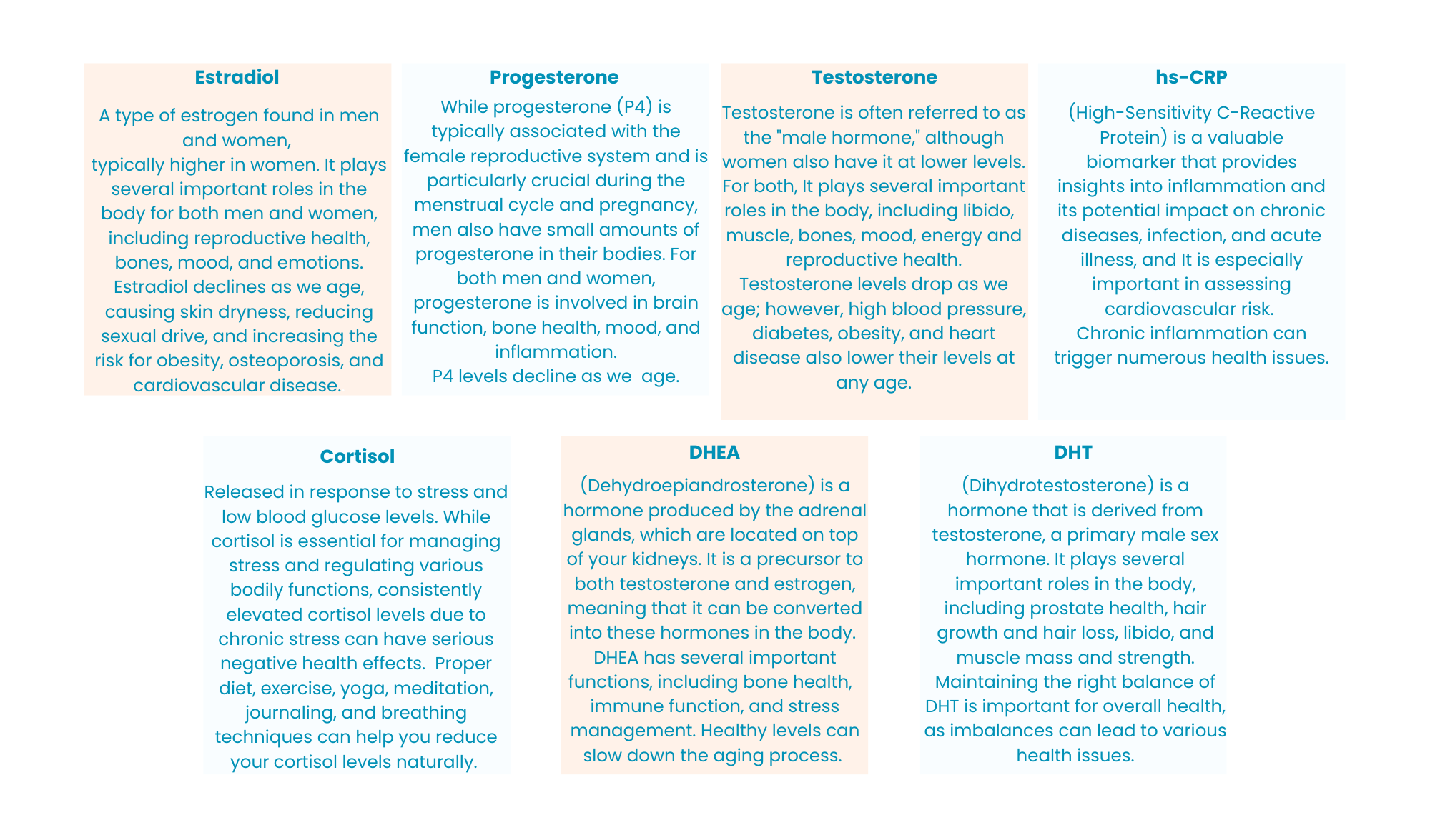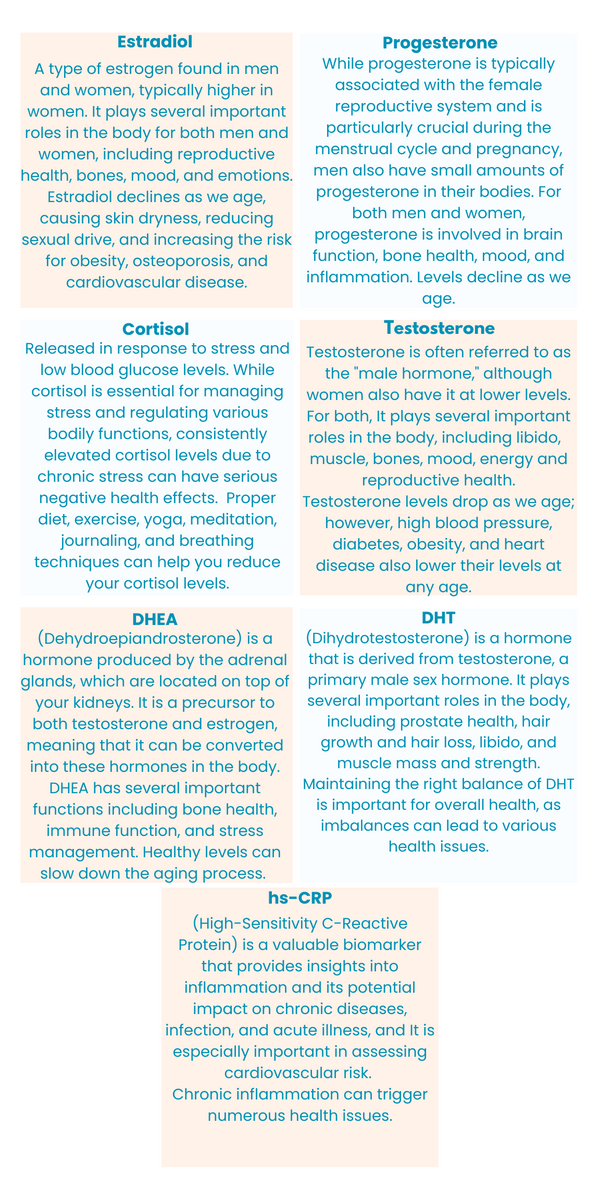 If you're looking to stay ahead of your health, our comprehensive panel covers you! It tests for all the key hormones that influence various aspects of well-being and gives you reliable data to tackle any potential issues proactively. Walk away with peace of mind, knowing the best steps to take when caring for yourself.